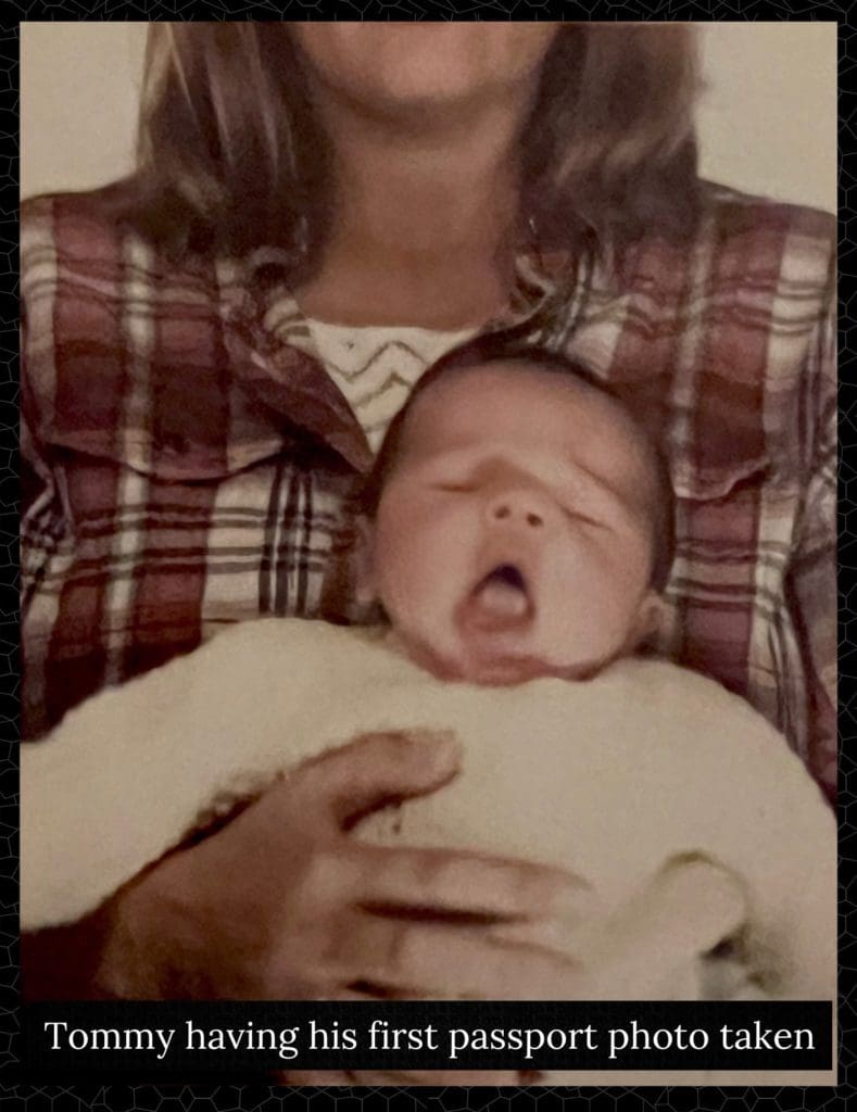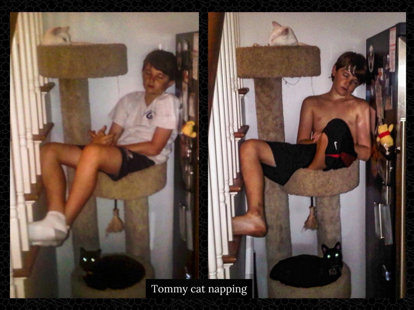 Growing up, our childhood was far from average. We crossed the Atlantic twice, living in five different counties and seven different houses by the time Tom was eight. His first passport photo was taken at just two weeks old, propped up precariously against our mum’s chest. He took his first flight at only six weeks old and was an absolute charm, sleeping the whole way through. This was the first sign of one of Tom’s more peculiar personality traits – his knack for napping anywhere, anytime. Floors were a recurring favorite, as were staircases and chairs, both at home and in restaurants, airports, and malls. He even managed to fall asleep on the cat’s climbing tree, not once but twice!