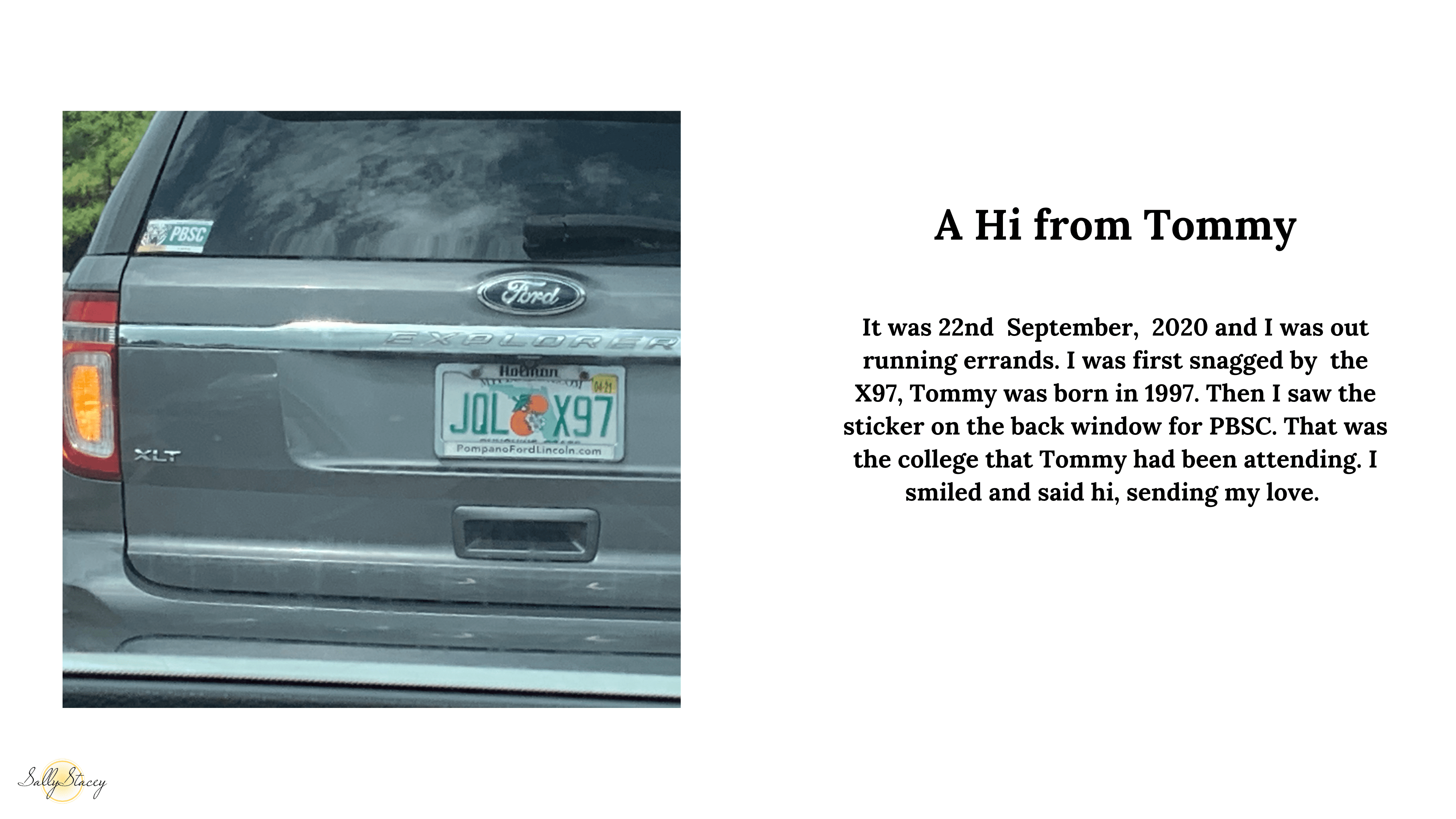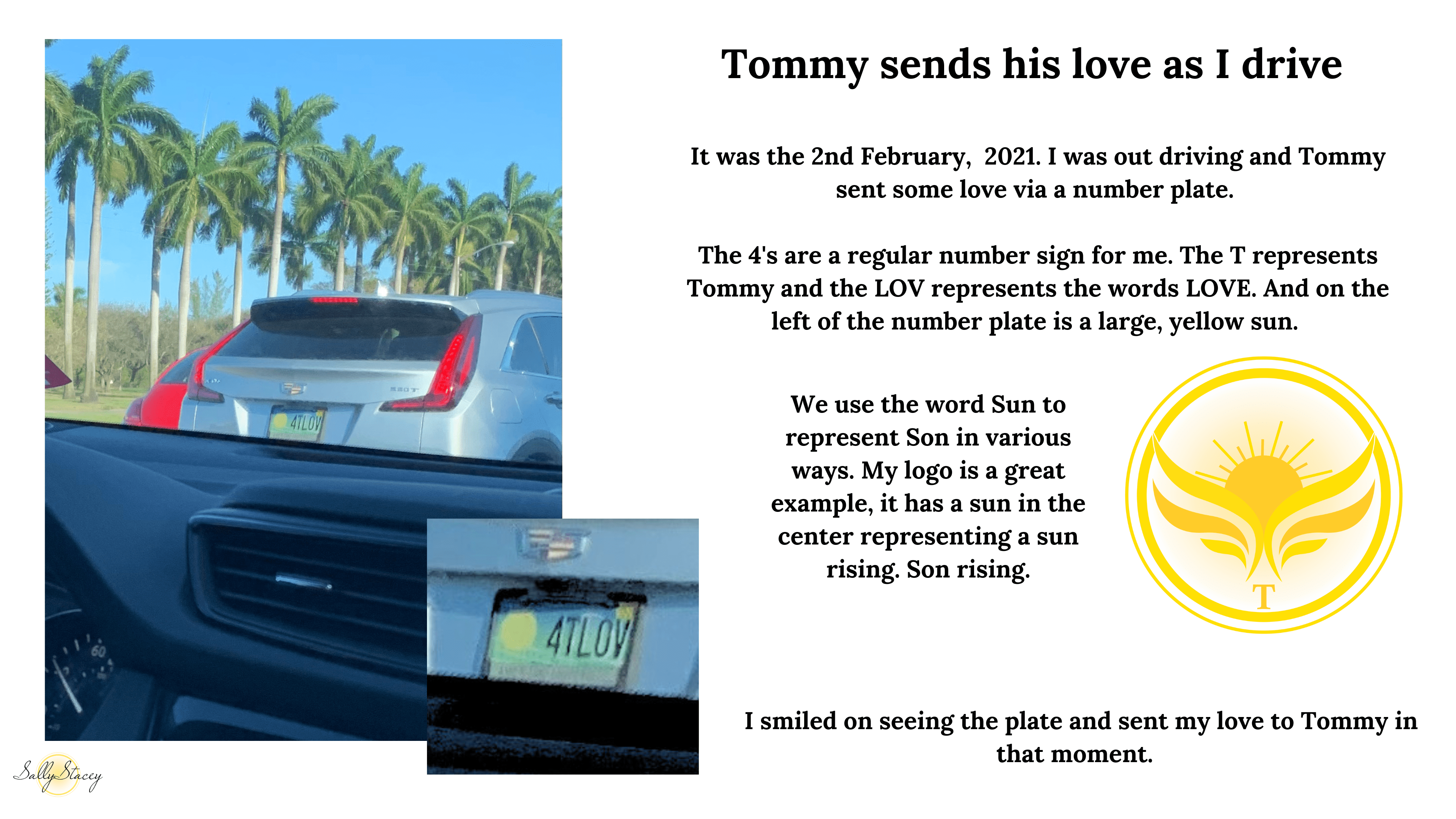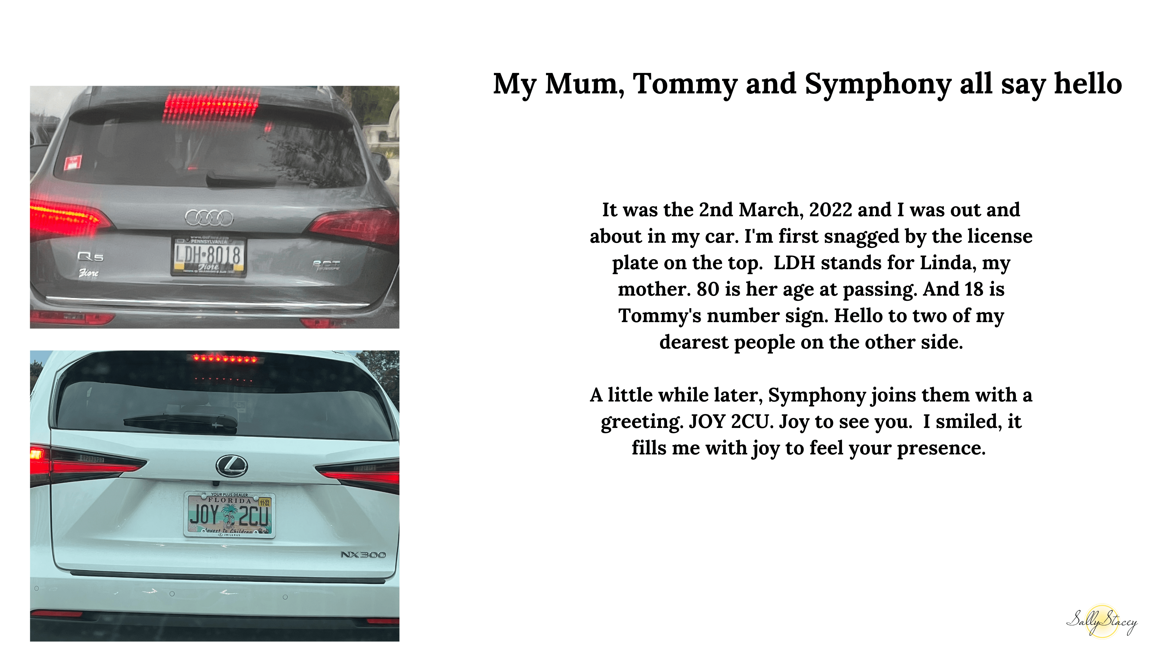 I don’t spend a lot of time in my car. I work from home and my favorite place to be since my son passed is in my garden. It’s where I feel most at peace and connected. But life dictates that I do have to venture out sometimes and when I do, I try to remain mindfully present and open to any signs or messages that the spirit world may wish to send my way. Receiving messages via car number plates and stickers on cars is a lot of fun. Sometimes the message can be a simple hello, other times there are messages given that are relevant to real time happenings at that moment. There’s a sort of coded language that is used with me and I can instinctively understand what is being conveyed. Below I have shared a selection of different messages that I’ve received. Enjoy.