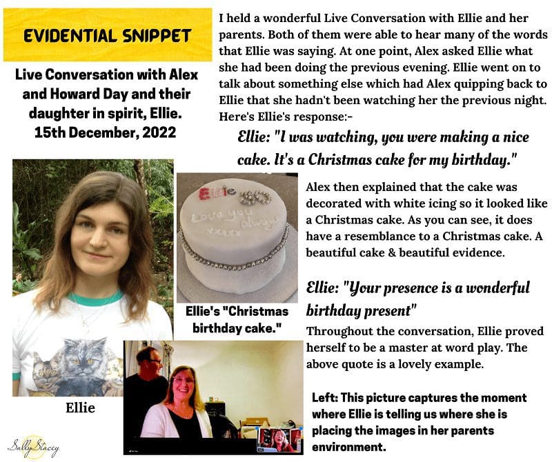 On several occasions, I was able to hear what Ellie was saying before Sally said anything, which I think was truly amazing. During the conversation evidential information just popped out naturally and other elements of the conversation correlated with information obtained from readings I have had previously with mental mediums.