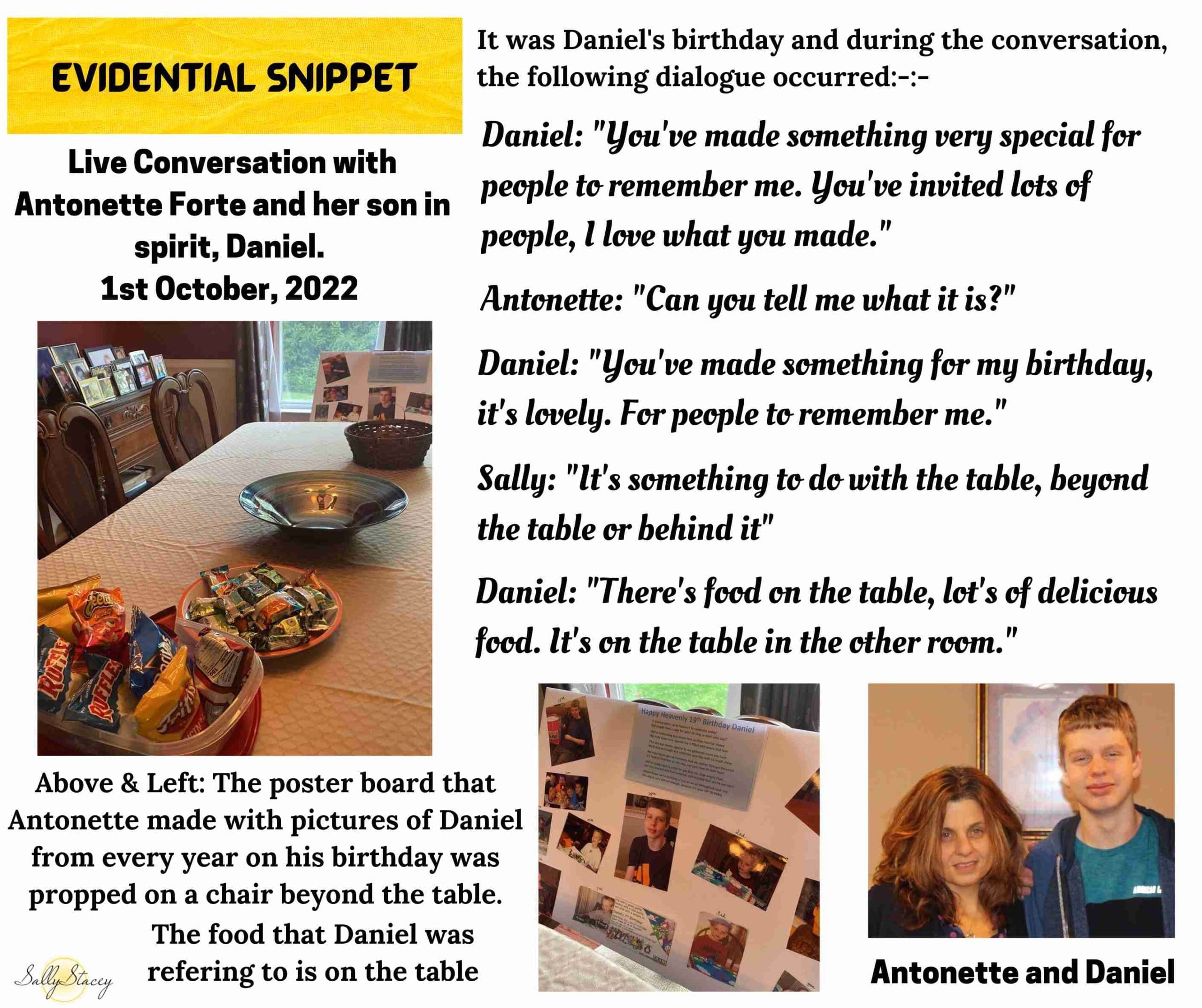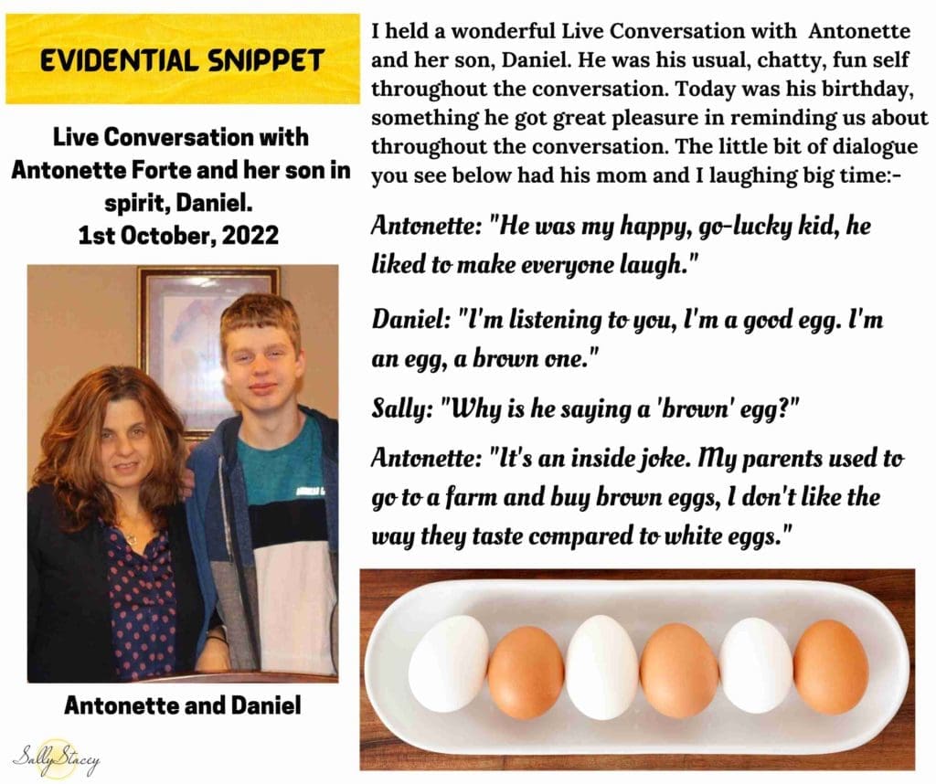 It was the 1st October, 2022, Daniel’s 19th birthday. He was thrilled to be having a conversation with his mom, telling her that he knew that she had lots to do for his birthday and letting us know how excited he was for what his mom was planning. He talked about his birthdays when he was little, how he used to open his presents with his brother before he went to school. He went on to talk of rainbows and blowing out candles as he continued to reminisce about his birthdays. His mom asked him about how Lazer was doing, to which Daniel confirmed that he had Lazer with him, that she is with Jazzy. Jazzy and Lazer are both cats. Antonette then asked Daniel to give them both a kiss, which Daniel did and then he confirmed that they were both happy. He went on to say that it’s lovely for children to have animals, as they are playful. Daniel then mentioned that his ‘favorite’ person was coming over which made his mom smile. He always called her sister, Amy, his favorite and she was indeed due to come round in the afternoon. He mentioned that his brother would be there too and that they were close. They used to play video games and his brother couldn’t beat him. Antonette confirmed that to be true. Plenty more was said, including detail regarding his birthday cake and also about his aunt Amy’s baby, a little girl who she named Daniella. Two of the evidentiary elements of the conversation are shown below, wonderful moments in the conversation. He finished by jokingly calling himself a momma’s boy, something which made his mom laugh. He responded to her laughing by telling her how he loved to hear her laugh with him. Such a beautiful coming together and conversation on Daniel’s birthday.