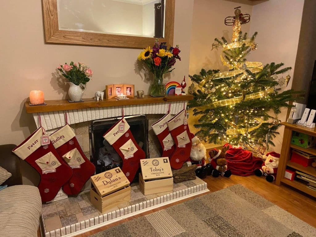 Dylan spoke a lot about Christmas and mentioned that I had some presents for his cousins in front of me on the table and also something to read to his brother. I did in fact have lots of items on the table including some gifts for his cousins and also a pile of books from his brother’s advent calendar. Dylan also said that I had presents for him and a stocking and that I put things in the stocking for him. He said the stocking is the same as his brothers and it has their names on it so you know the difference. Dylan also mentioned the Christmas ornament that has his name on it and he said this is across the room. I am very particular about my tree and so the personalised ornaments go on a separate display tree which is across the room and of course I do have presents for Dylan and I do fill his stocking too. Dylan also mentioned a gift for his dad and he said it includes him. One of the gifts I got for my partner from the boys was a t-shirt which I could personalise by choosing how many little dinosaurs to have on the design and of course I included Dylan.